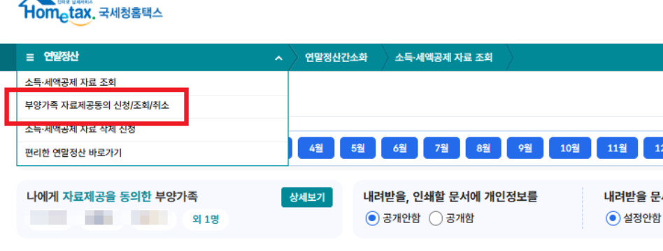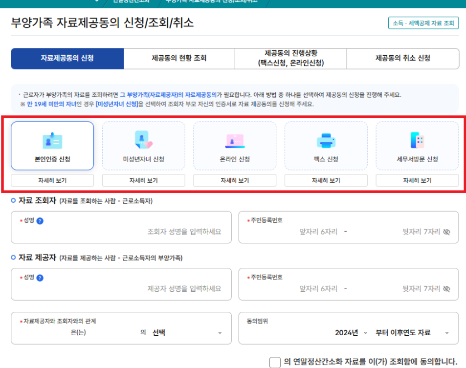 새롭게 부양가족 등록이 필요한 경우, ' 부양가족 자료제공동의 신청/조회/취소' 메뉴로 들어가셔서 하시면 됩니다.