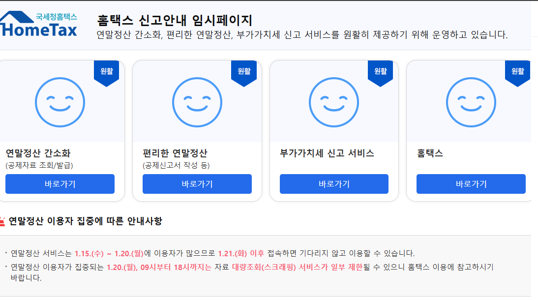 연말정산 간소화 서비스는 1월15일~20일에는 이용자가 많으므로 21일 이후 접속하면 기다리지 않고 이용할 수 있다고 안내해주고 있습니다. (지금 22일 현재,,, 아주 원활하게 접속이 가능합니다!!)