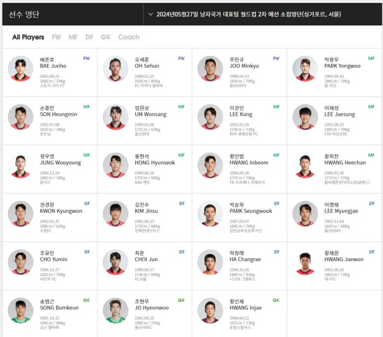 * 김민재 선수, 조규성 선수는 부상 등의 이유로 이번 선발전에는 제외되었다고 합니다.