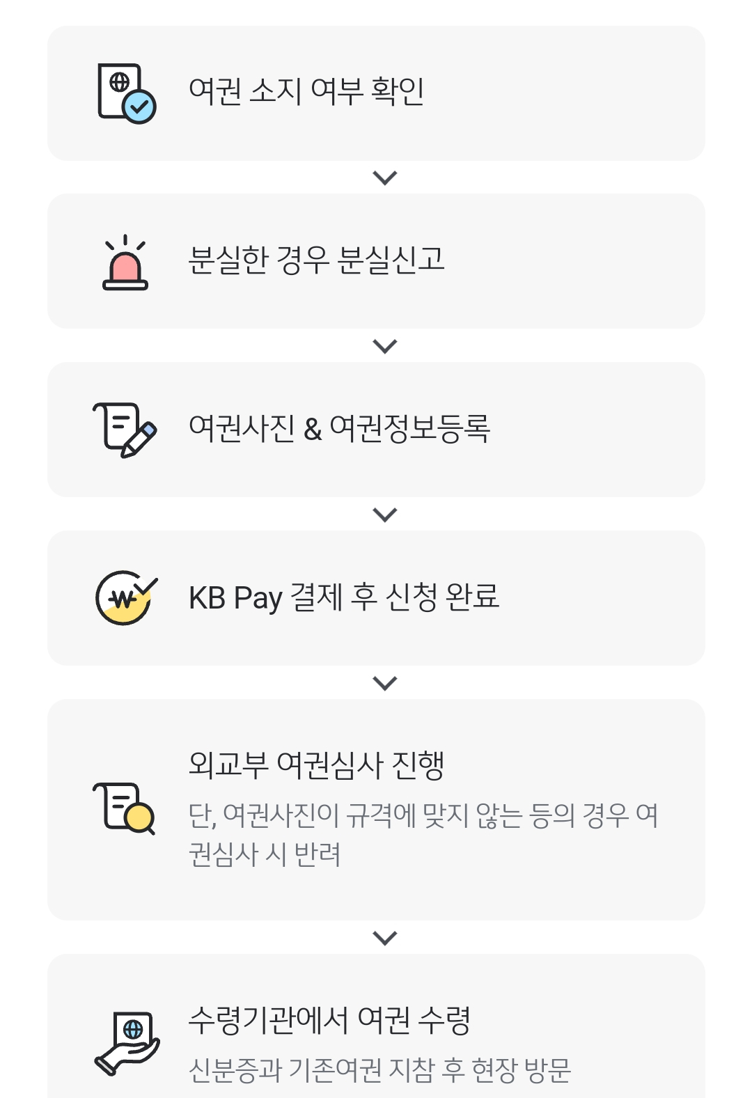 앞서 말한대로 여권 재발급의 번거로움을 최소화하기 위해 민간앱인 KB국민은행 앱을 통해 여권 재발급이 가능하게 되었습니다.