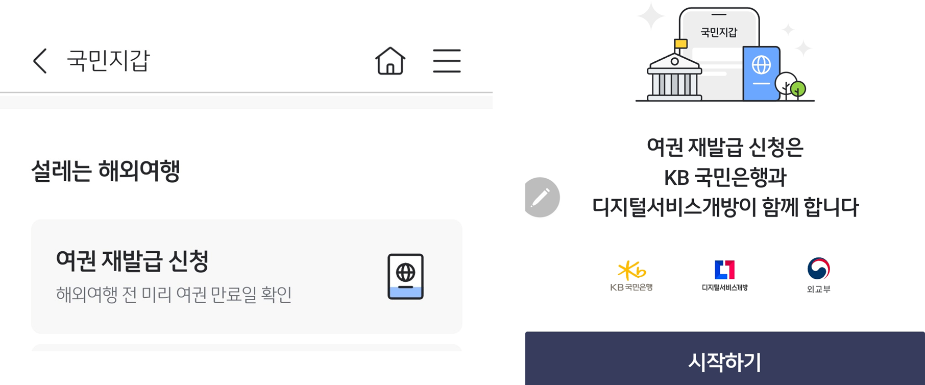 최근에는 KB국민은행에서 운영하는 KB스타뱅킹> 국민지갑에서도 여권 재발급 신청을 편리하게 할 수 있습니다.
