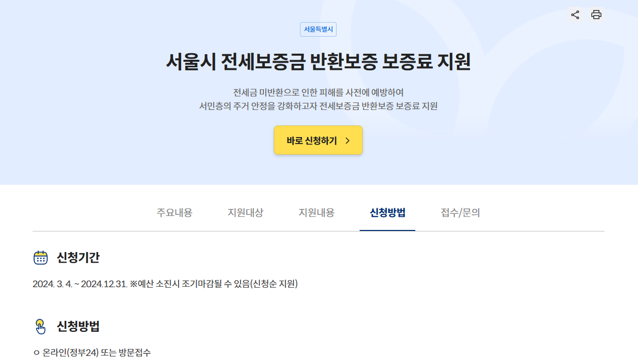 - 지원액 : 기납부한 전세보증금반환보증 보증료에 대해 전부 또는 일부(최대 30만원)를 지원