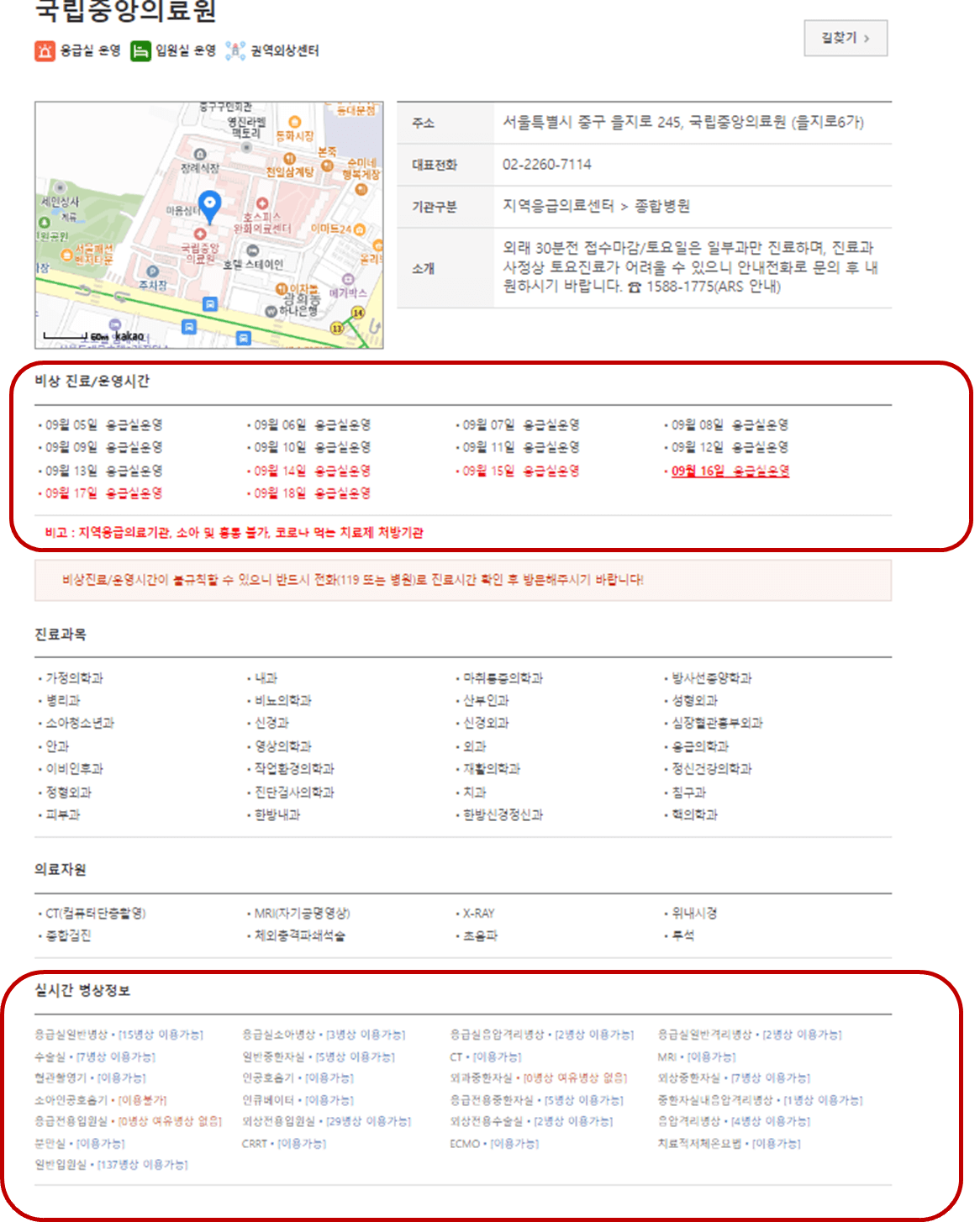해당 병원의 상세보기를 누르시면 아래와 같이 현재 응급실 이용 가능 시간과 실시간 병상정보에 대해서 알 수 있습니다.