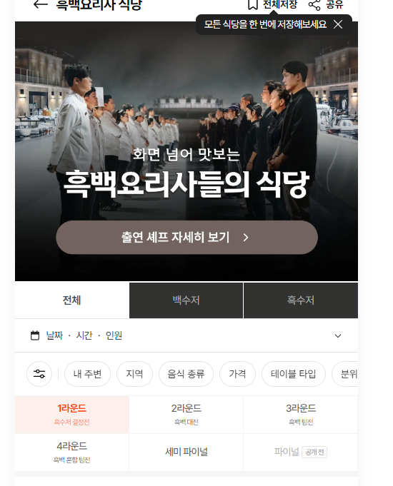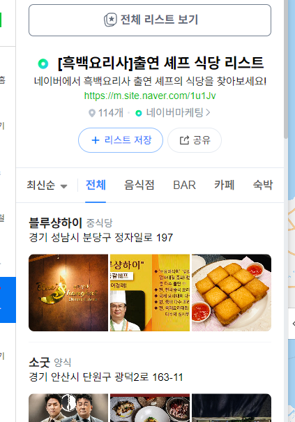 여기서 상단에 리스트 저장을 클릭하면 네이버 저장 리스트에 흑백요리사 식당 리스트 폴더가 생성돼서 나중에 찾아보기도 편하실 겁니다.