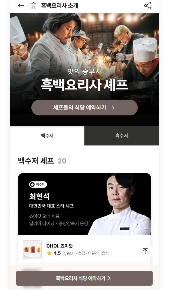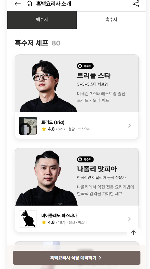 캐치테이블 메인 화면에 들어가면 흑백요리사들의 소개를 볼 수 있고 쉐프마다 운영하고 있는 식당 리스트를 한번에 볼수 있어요~ 특히 백수저/흑수저를 나눠놔서 원하시는 셰프를 좀 더 쉽게 찾을 수 있는 점도 좋더라고요~