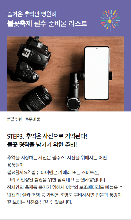 또한, 수분 보충을 위한 이온음료, 사진 찍기 위한 삼각대(셀카봉), 청결을 위한 물티슈, 비닐봉지(쓰레기정리), 만약을 위한 보조배터리 등입니다. 불꽃놀이를 동영상으로 담다 보면 배터리가 금방 방전되기 때문에 미리미리 준비하시면 좋을 거 같습니다.
