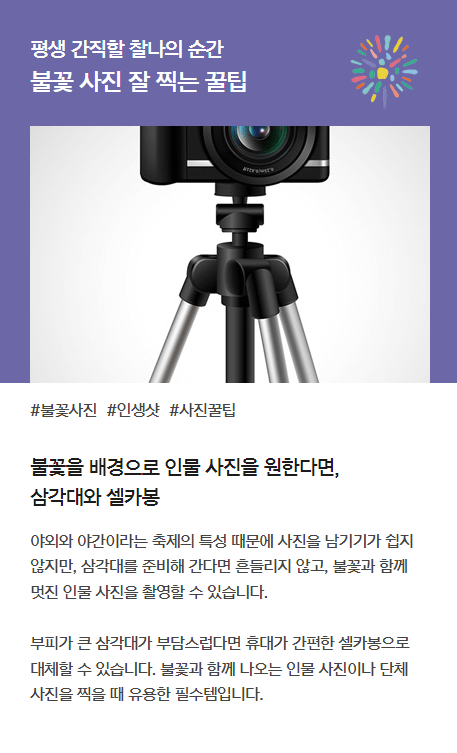 불꽃을 배경으로 인물사진을 원한다면 삼각대와 셀카봉이 필요합니다.