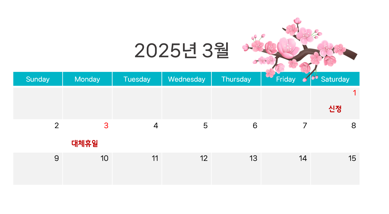 3월은 공휴일이 총 2일이 있는데 3일 대체휴일로 최대 3일의 연휴를 즐길 수 있습니다.