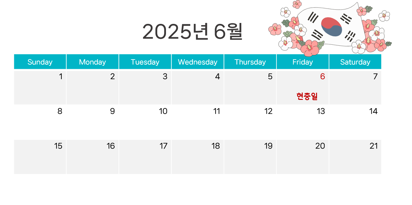 6월은 공휴일이 총 1일이 있는데 최대 3일의 연휴를 즐길 수 있습니다.