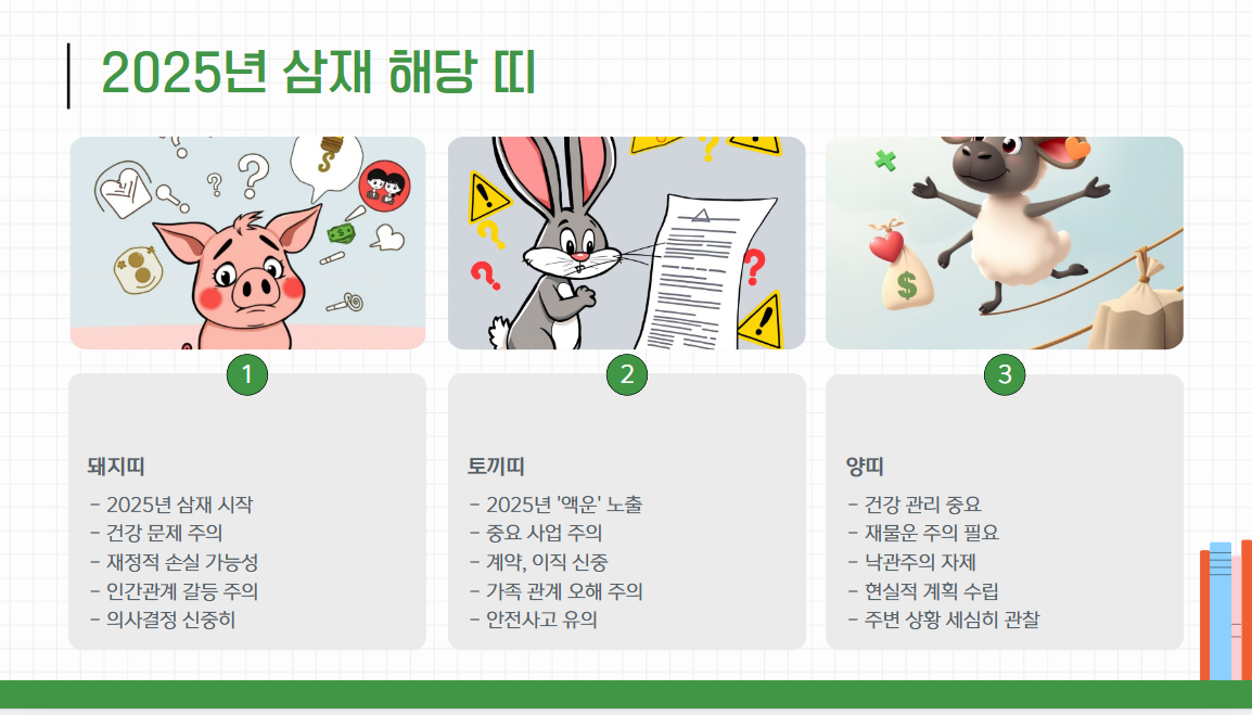 양띠는 2025년 삼재 중에서도 특히 건강과 재물운에 주의해야 합니다. 지나친 낙관주의나 방심이 문제를 일으킬 수 있으며, 주변 상황을 세심하게 살피고 현실적인 계획을 세우는 것이 필요합니다.
