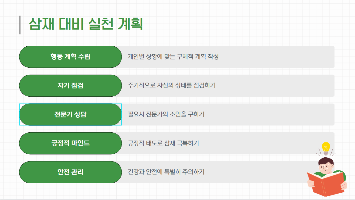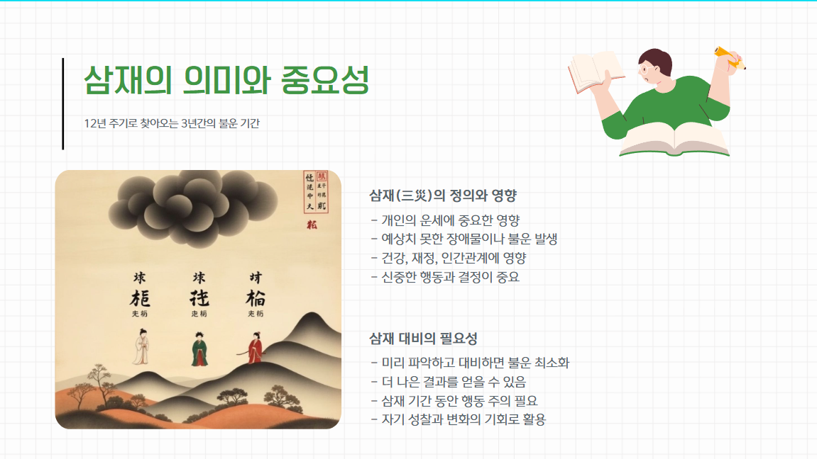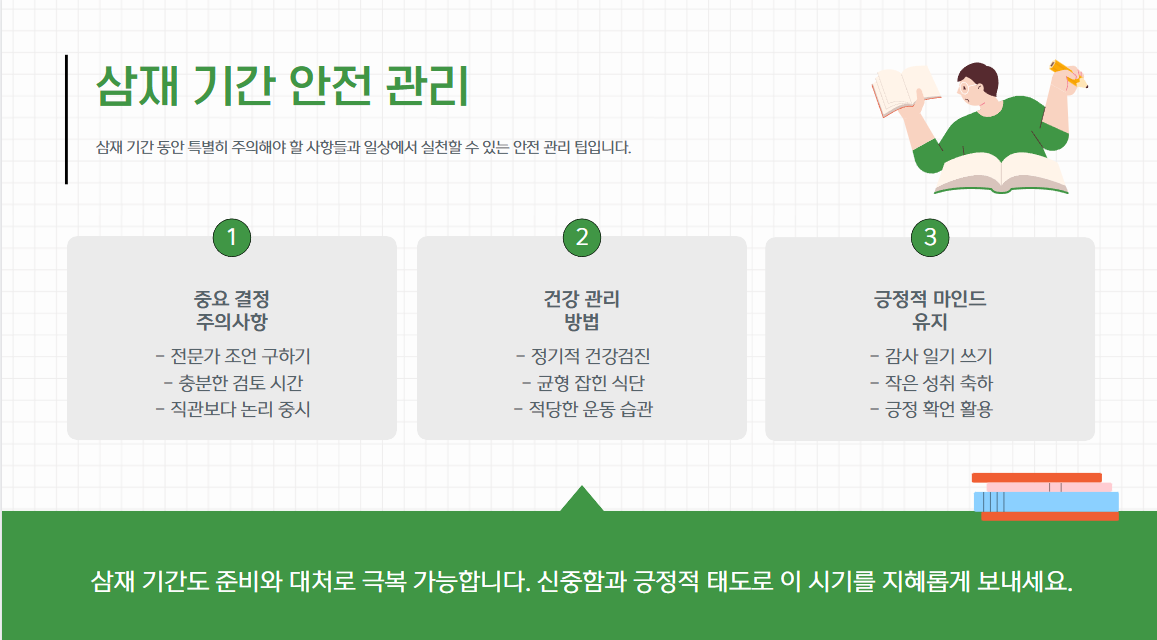 삼재를 두려워하기보다는 이를 긍정적으로 받아들이고 철저한 준비와 대처로 안전하게 극복할 수 있습니다.