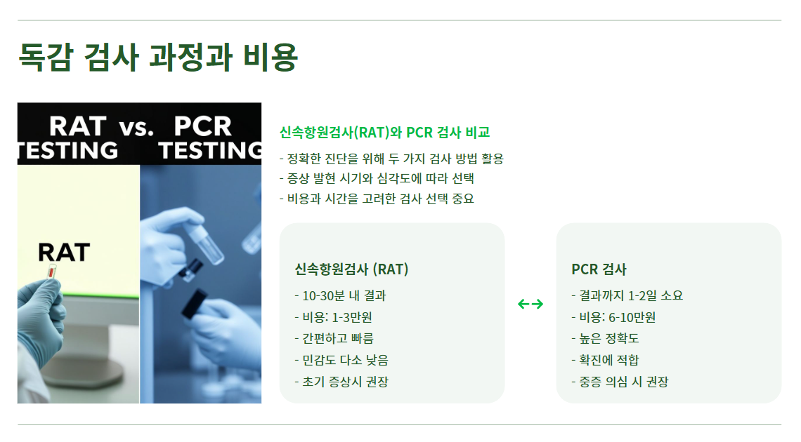 또한 독감 증상이 폐렴 등 다른 호흡기 질환과 유사한 경우, 추가 진단 목적으로 검사를 진행하면 건강보 험이 적용될 수 있습니다.
